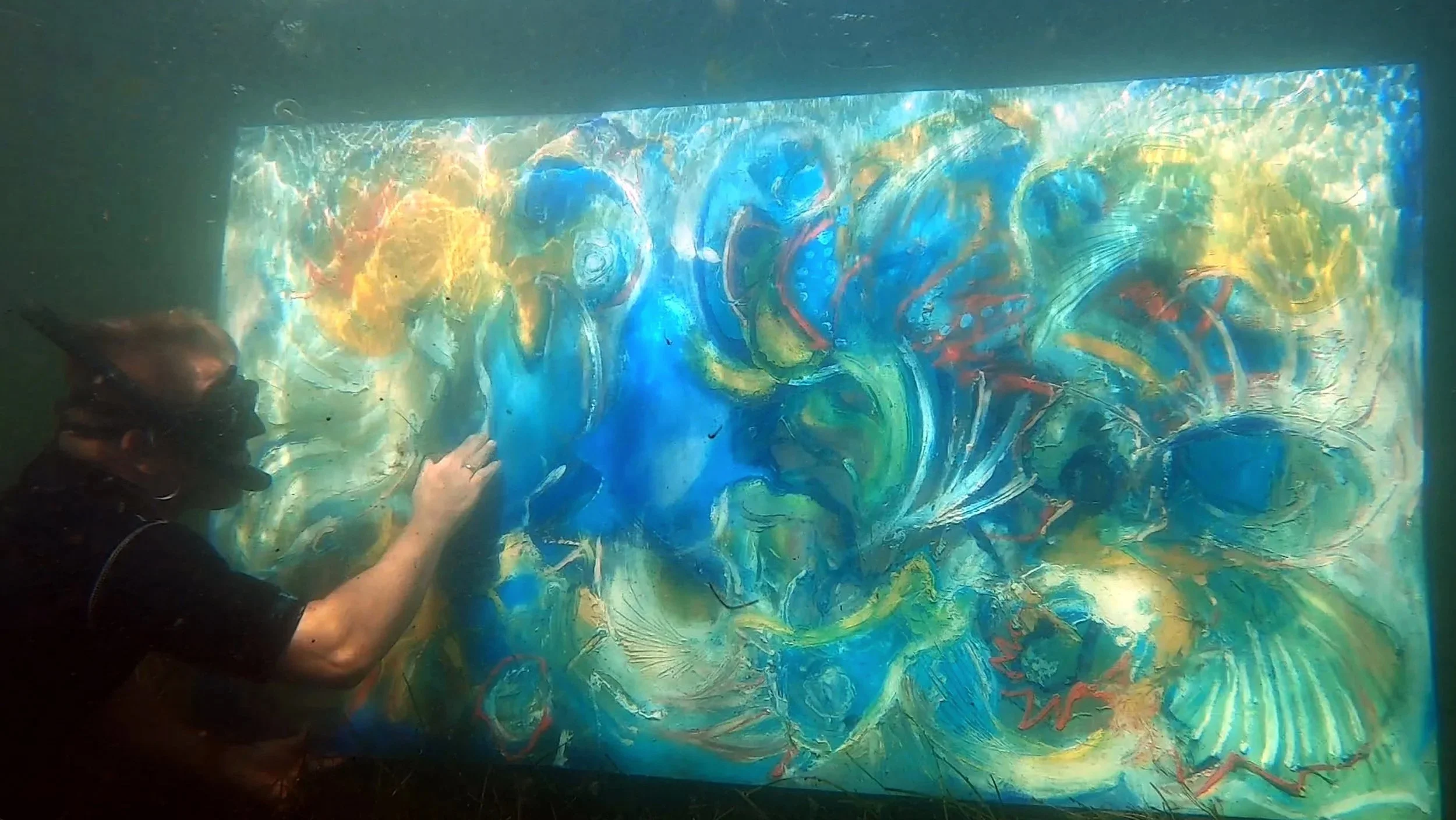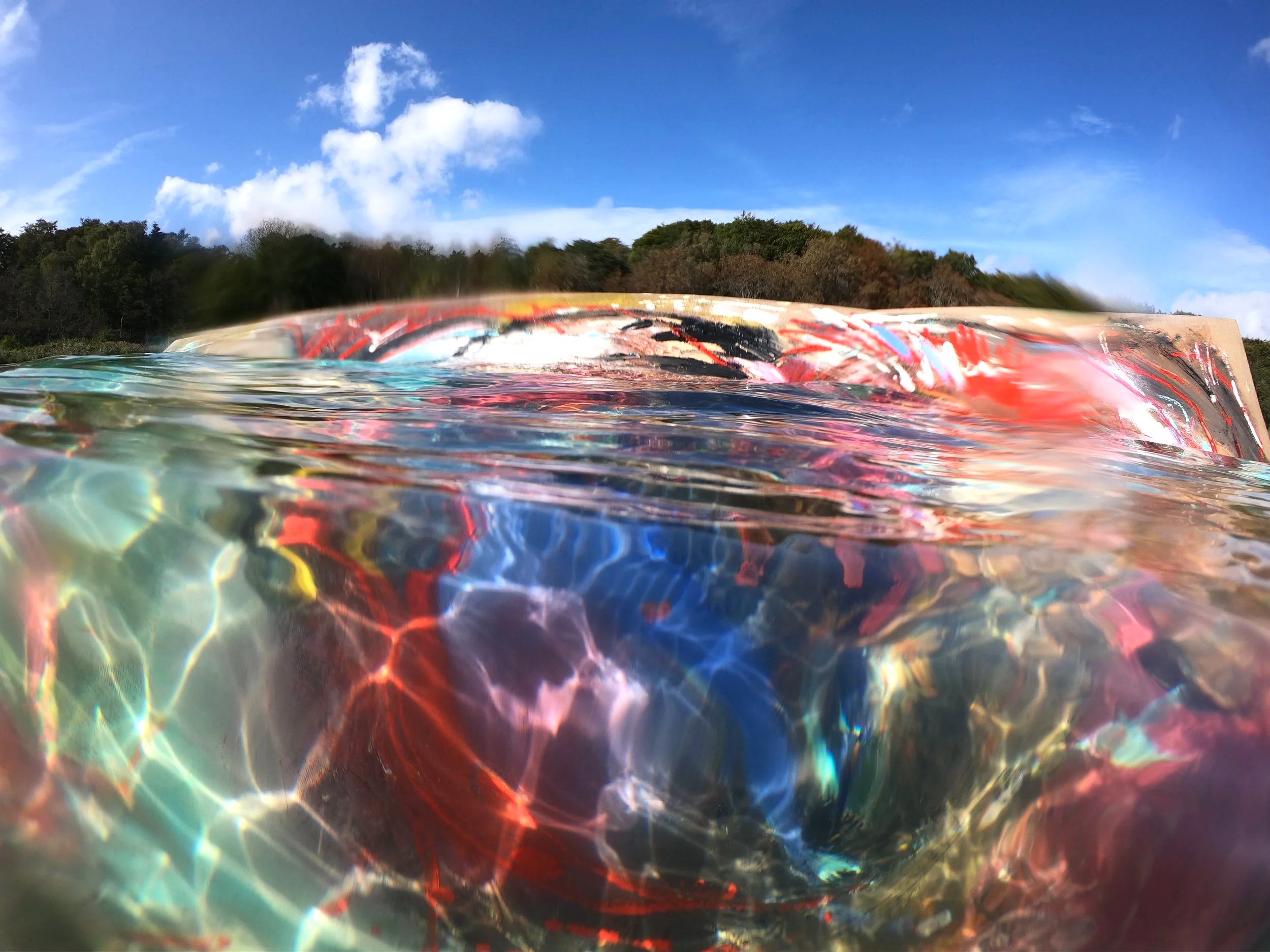 Arbejdet med serien Tidelines - olimaleri der males i havet. Piigmenter og proces er ugiftigt for havmiljøet.