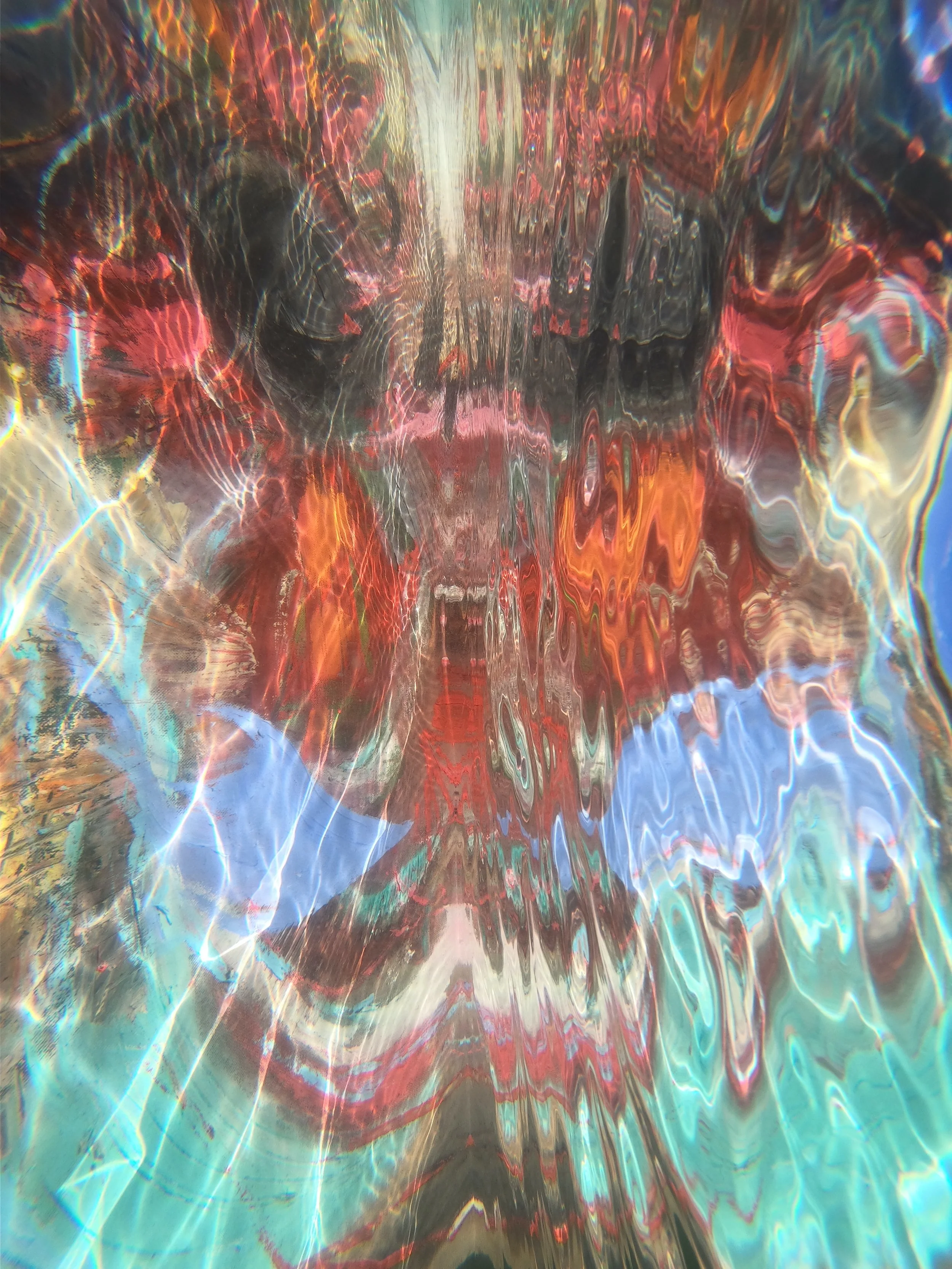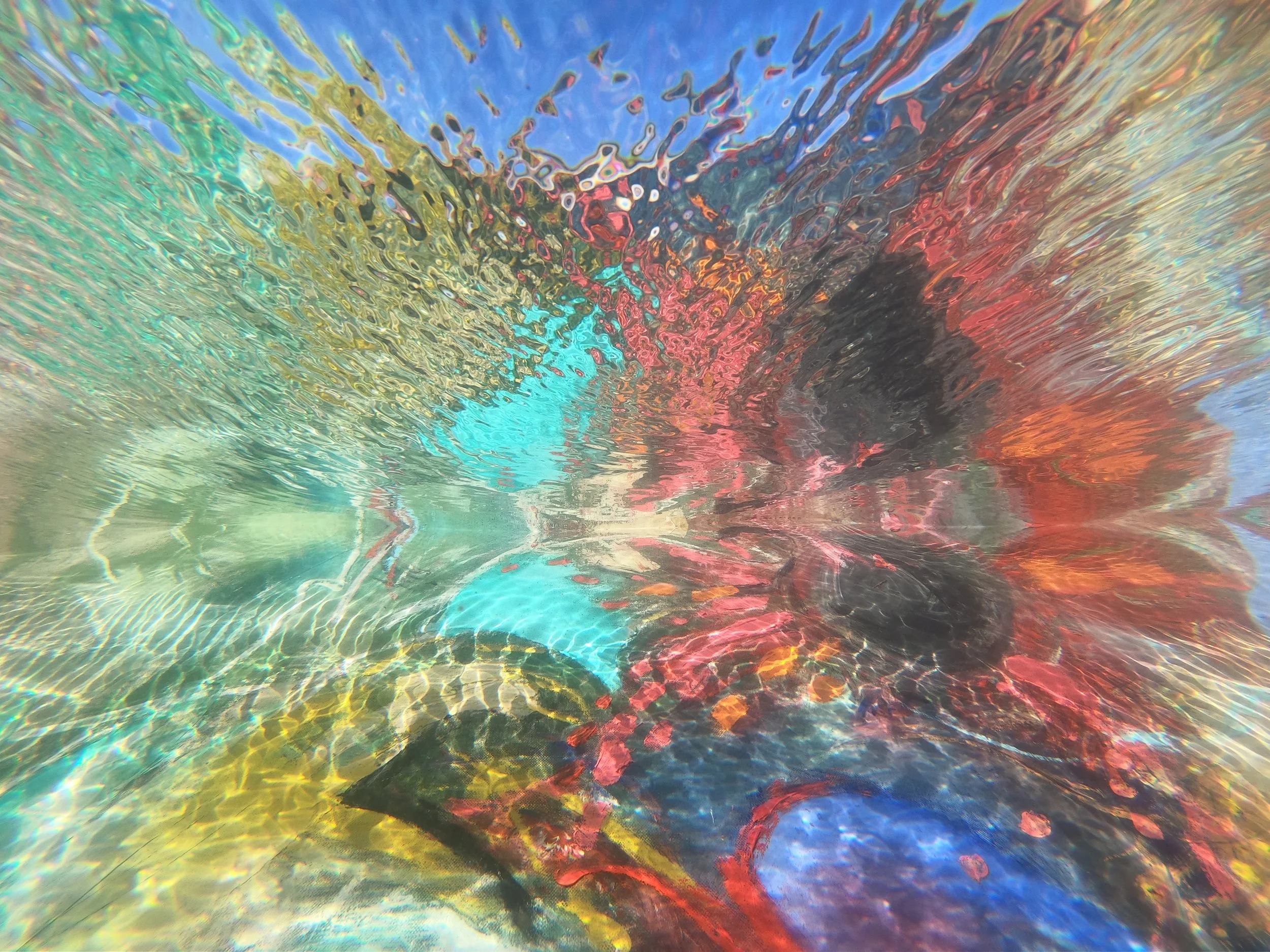 I Caustica installeres malerierne lige under vandoverfladen, hvor lysbrydning og bølgebevægelser danner caustics – mønstre af lys som bevæger sig i bølger. Værkerne dokumenteres fotografisk under vand, så samspillet mellem lærred og lys kan fastholdes som en del af det kunstneriske udtryk.